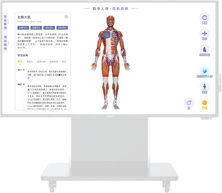 Jointly researched and developed by anatomy experts from top domestic universities and top 3D engineers. Based on anatomical sections in conjunction with clinical DICOM image data, the standard male/female 3D human body database is completed through the use of 3D art modeling technology, including 4,165 fine models, covering 12 major organ systems throughout the body. It is applicable to various professional medical scenarios such as medical education and doctor-patient communication.